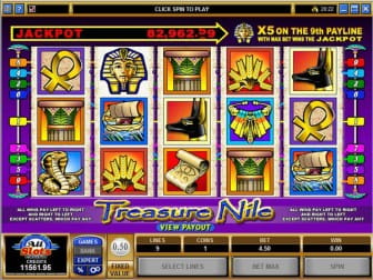 Adéntrate en los misterios del antiguo Egipto y intenta apoderarte del tesoro de los faraones con esta tragaperras a 5 rodillos Treasure Nile, una slot machine con 9 líneas ganadoras y jackpot progresivo.